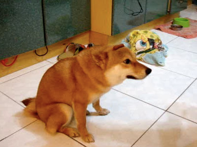 回家逗弄那可愛的小狗後,洗完小手痛苦的面對那需努力奮戰的午餐,耗時一個半小時終於把這大魔王吃了一大半,哀求著老爸幫忙吃完碗裡的飯菜。