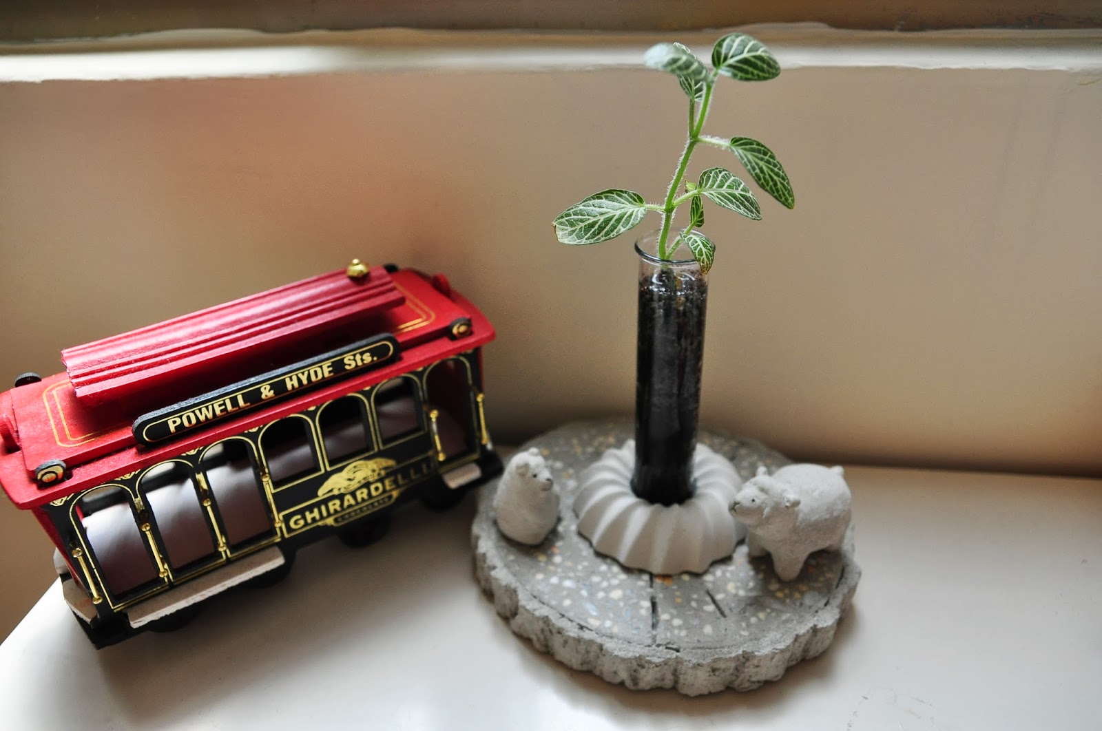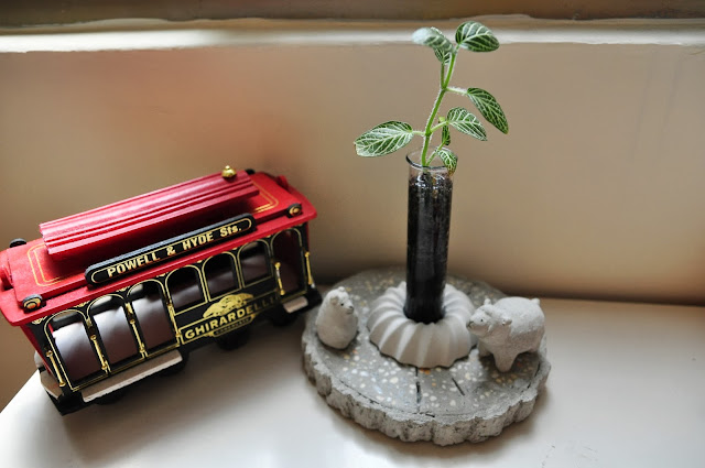 這張圖的重點是很假掰的動物們,有咩咩和熊熊,以後還會增加其他動物,牠們可是超輕吸水水泥做的唷!然後甜甜圈是拿來固定試管的,再加上一塊假樹幹,這些都是水泥做的,呵呵呵,自以為諾亞方舟咧!