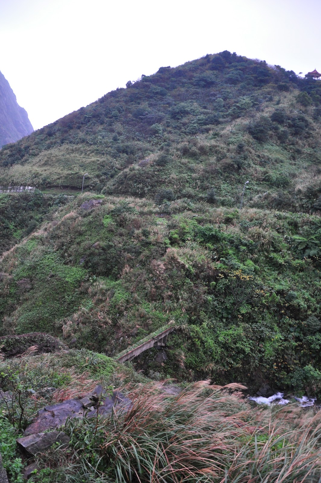 接著從第一座水圳橋迷路到最後一座遺留的水圳橋,那天風很大,又下雨,想挑戰大石公,但怕天雨路滑,這一滑就是斷崖,所以就乖乖的放棄。為了看水圳橋走在斷崖上還要怕被風吹落,底下的水流湍急,只好壓低身體慢慢走。