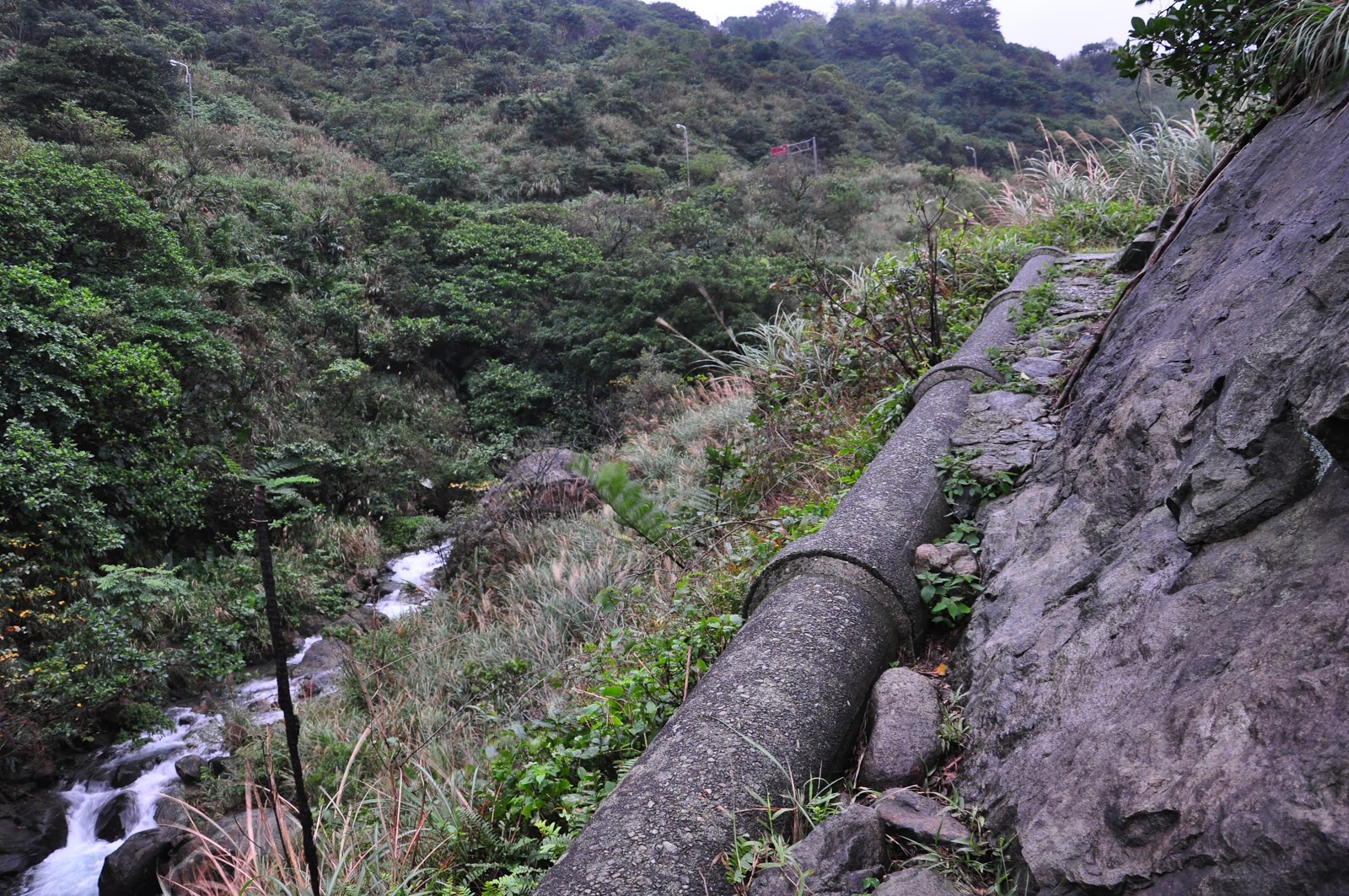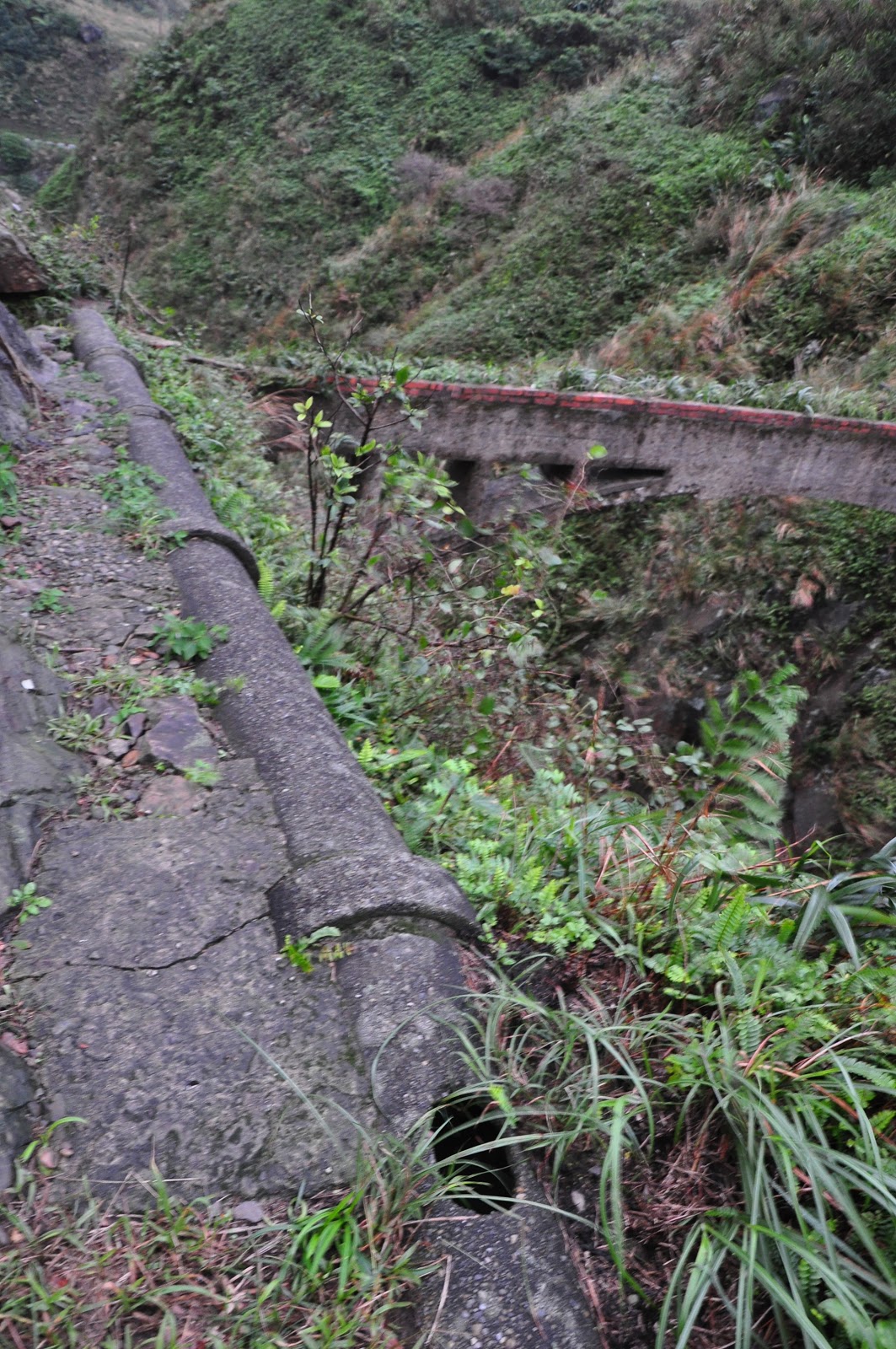 | 三十公分不到的路,水管右邊是斷崖, 水管接到水圳橋上方。 |