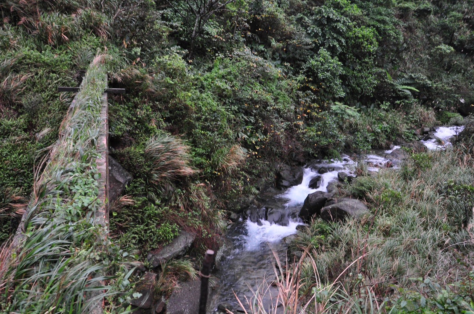 | 水很湍急,風很大,草都被吹成九十度,我放棄走上年久失修的水圳橋。 |